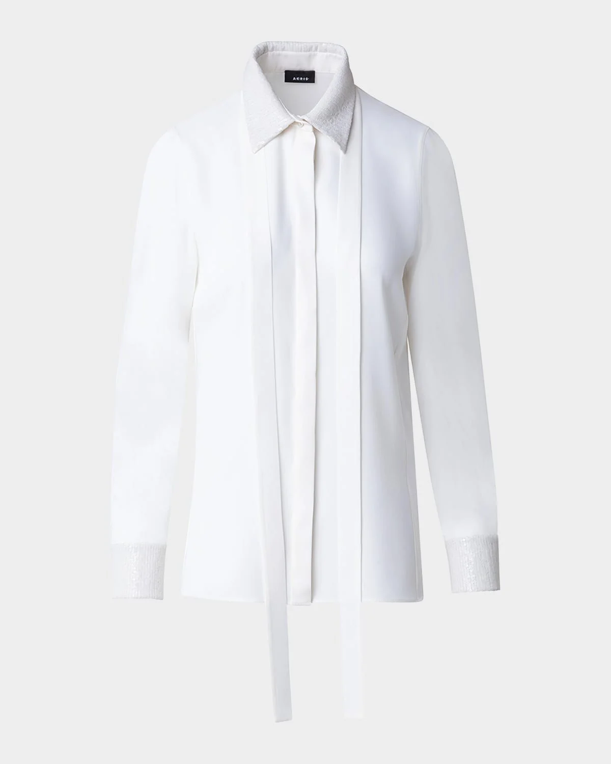Akris poplin tunic blouse with a neck scarf Spread collar; covered metal buttons Long sleeves; button cuffs Slight aline silhouette Silk/polyester/elastane Made in Romania