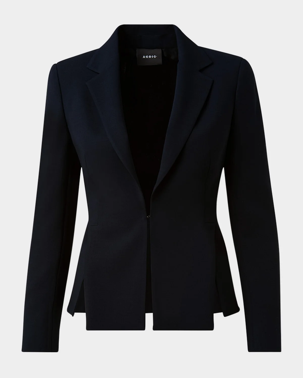 Akris "Ocelia" jacket in wool crepe. Notched lapel; hook front. Long sleeves. Slim, fitted silhouette. Mid thigh length. Cutaway hem. Wool/nylon. Made in Switzerland.