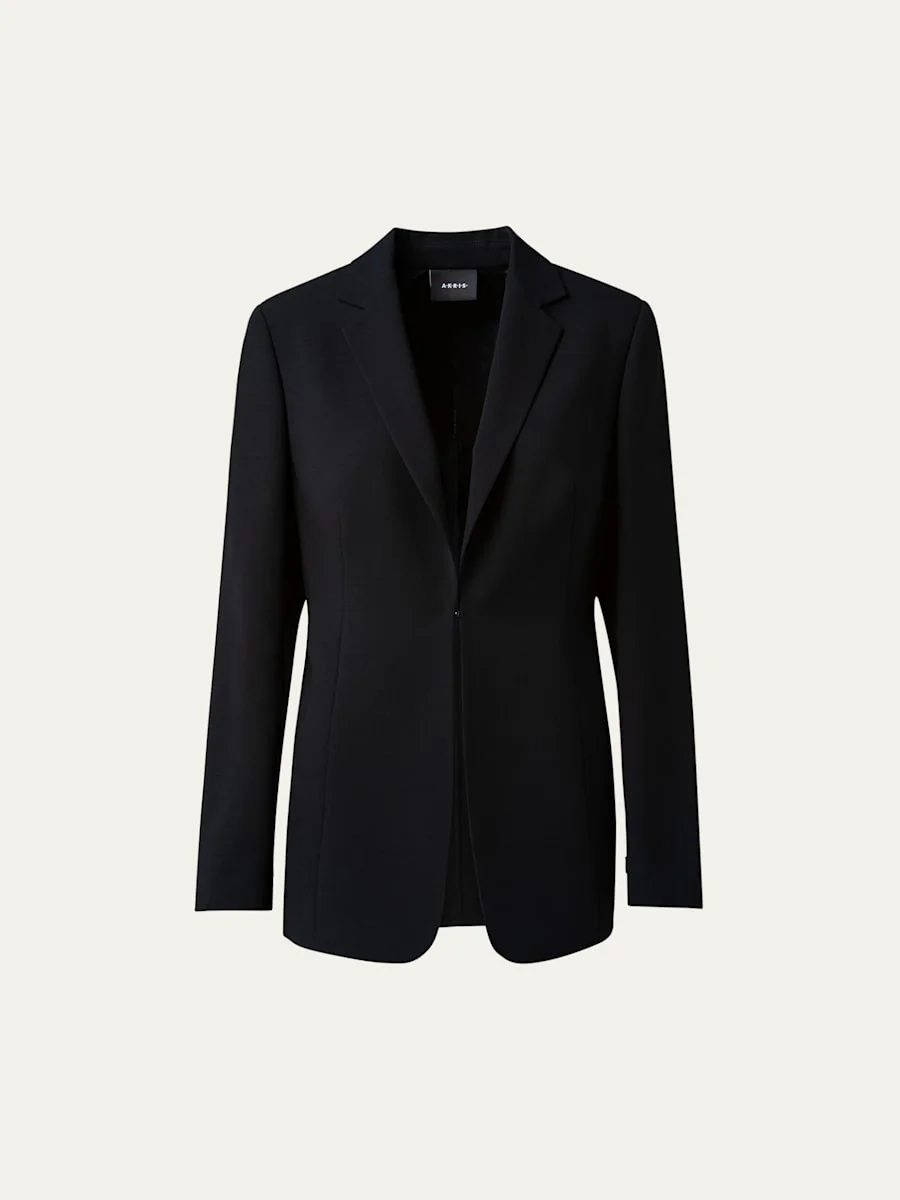 Akris "Odette" jacket in double face wool crepe. Notched lapel; hook front. Long sleeves. Slim, fitted silhouette. Mid thigh length. Cutaway hem. Wool/nylon. Made in Switzerland. Model is 5'10"/177cm. Online Inquiries: BGS21_B6TKN| Store Inquiries: #2704208