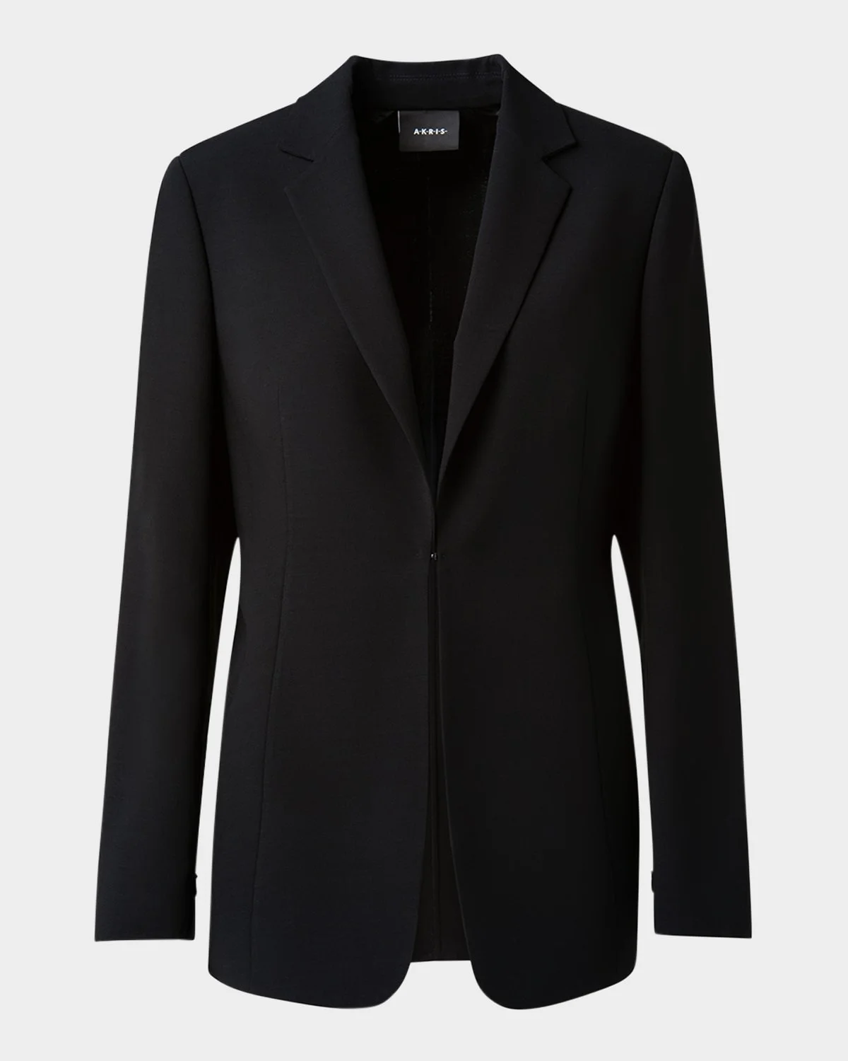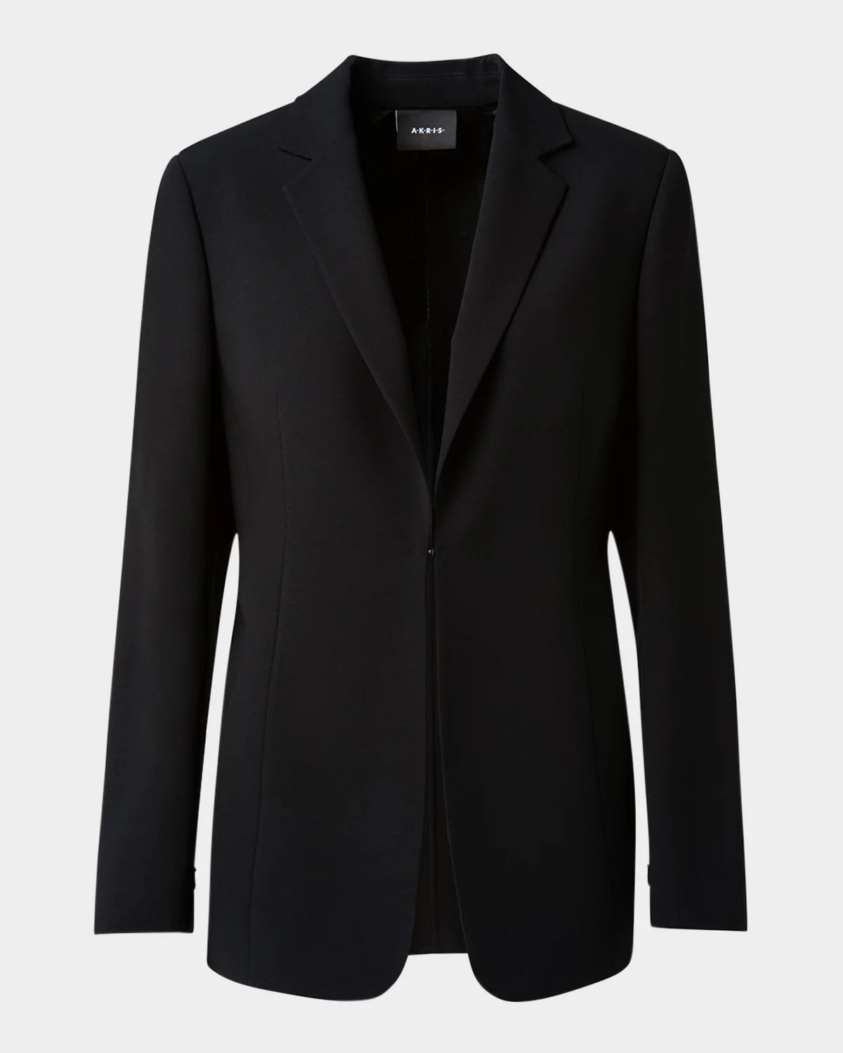 Akris "Odette" jacket in double face wool crepe. Notched lapel; hook front. Long sleeves. Slim, fitted silhouette. Mid thigh length. Cutaway hem. Wool/nylon. Made in Switzerland.