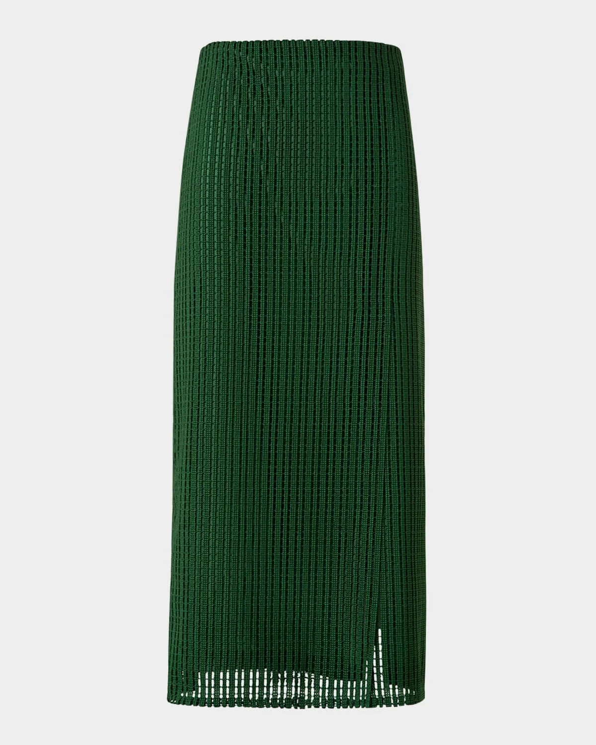 Akris techno stripe embroidered skirt High waist Midi length Pencil silhouette Front slit Back zip Polyester Made in Romania