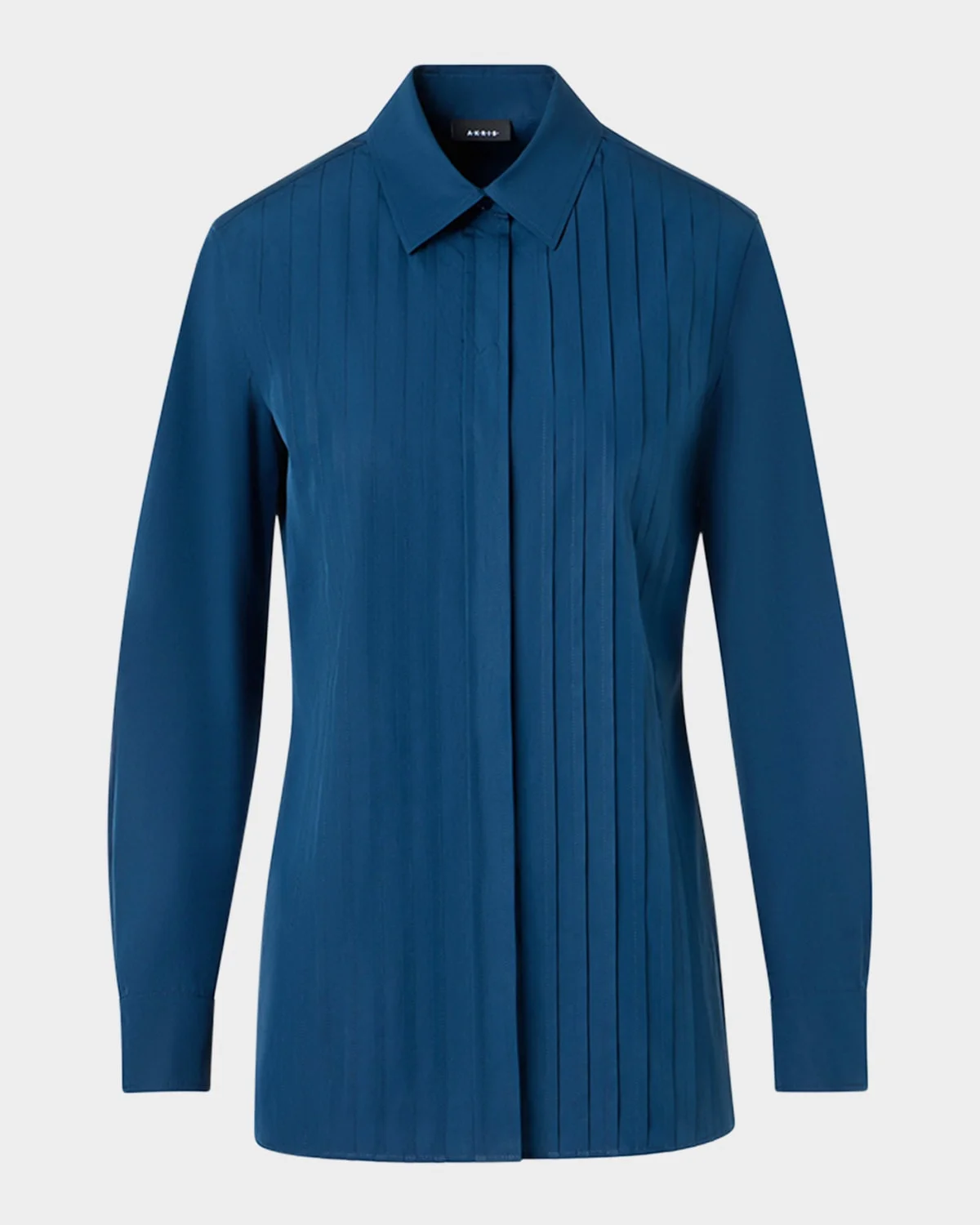 Akris shirt is crafted of cotton stretch poplin, finished with front pleats and side slits Point collar; concealed button front Long sleeves; button cuffs Relaxed fit Hip length Straight hem Cotton/nylon/polyamide/elastane Made in Romania