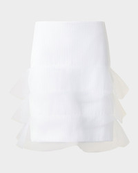 Akris ribbed mini skirt with cotton voile hatband wave ruffles Hem falls above the knee Aline silhouette Invisible back zipper Cotton/polyester Lining: Viscose/elastane Dry clean Made in Romania