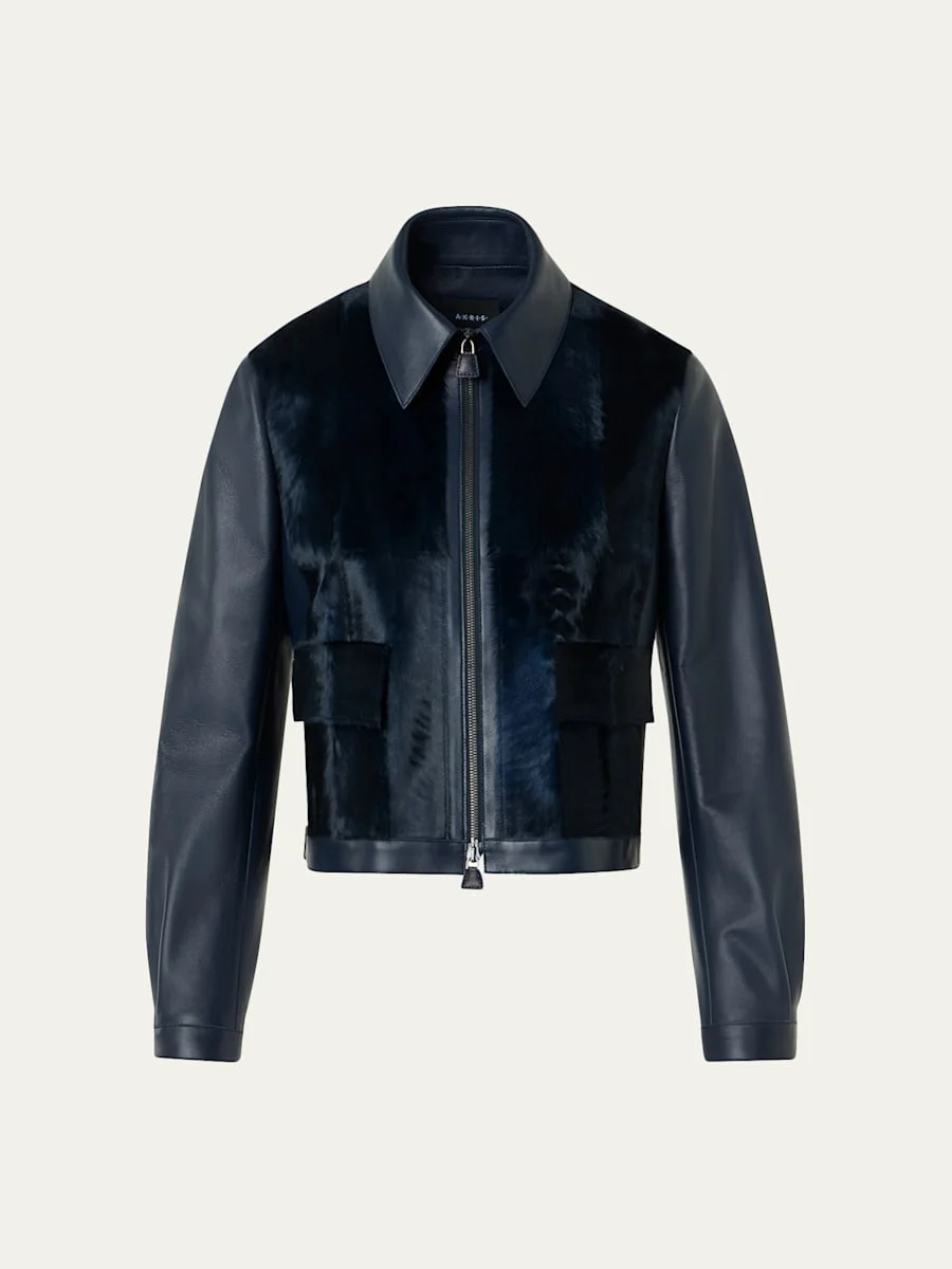 Akris "Sady" supple leather jacket features natural and dyed lamb shearling (China) front panels with a silky shorthaired finish Point collar; twoway zip front Long sleeves; snap cuffs Hip patch pockets Straight fit Hip length Buckle hem details Shearling/leather/silk Lining: Silk/elastane Dry clean Made in Romania