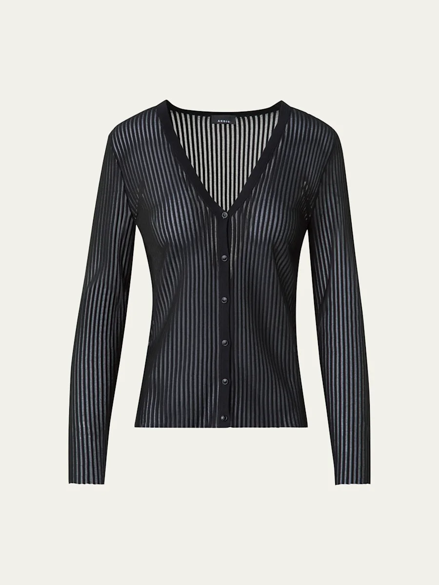 Akris knit cardigan features structured lines with semi-transparent detailing V neckline; button closure Long sleeves Straight fit Silk/cotton/nylon/polyamide Dry clean Made in Romania Online Inquiries: BGS21_B9UFL| Store Inquiries: #4970788