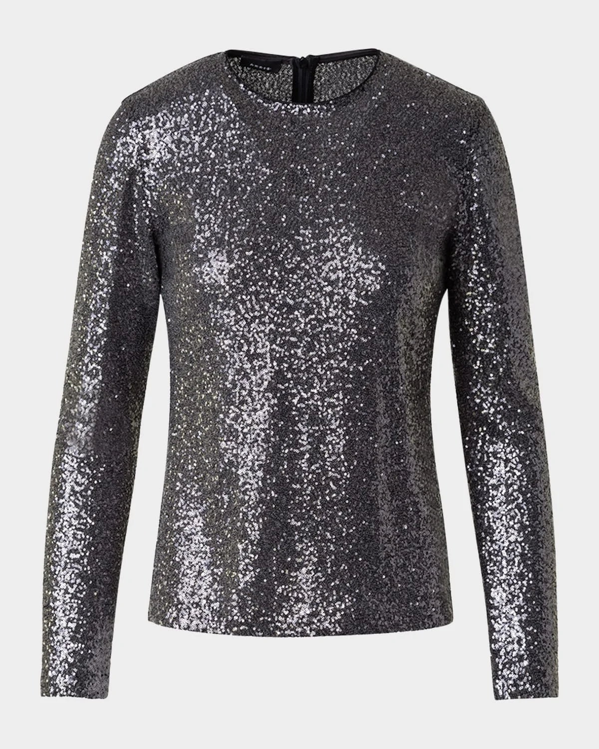 Akris jersey top in an allover sequin finish Round neckline Long sleeves Hip length Fitted Back zip closure Polyester/elastane Lining: Silk Dry clean Made in Romania