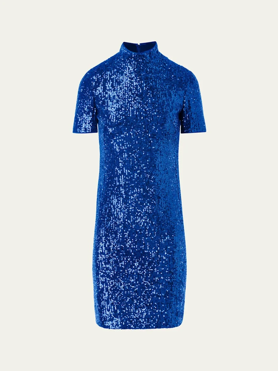 Akris dress in shimmering sequined jersey, blending luxurious sparkle with a sleek figure-flattering silhouette Mock neckline Short sleeves Hem falls above the knee Back zip Polyester/elastane self/lining Dry clean Made in Romania Online Inquiries: BGS21_B9VFX| Store Inquiries: #4982112