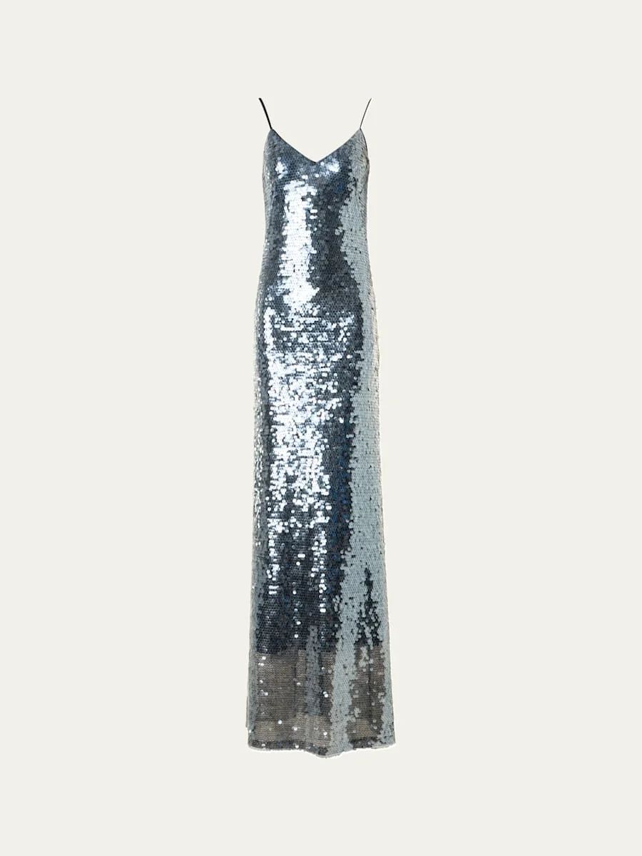 Akris slip gown is crafted of a lightweight tulle cut on the bias embellished with allover lucid sequin embroidery and features a high side slit V neckline Sleeveless Trumpet silhouette Floor sweeping hem Invisible back zip Polyester/nylon/polyamide/metal Lining: Viscose Dry clean Made in Romania