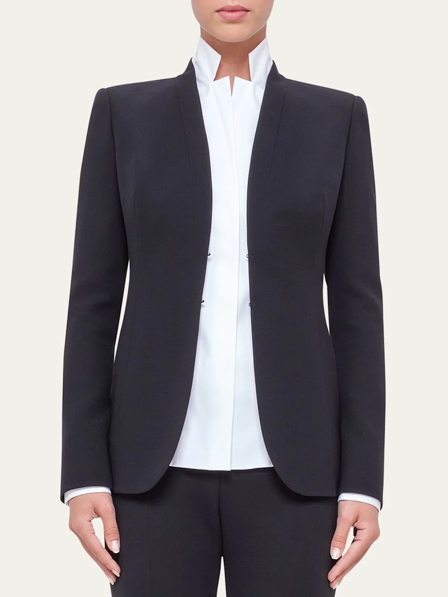 Akris wool-blend jacket. Shawl collar; hook-and-eye closures. Long sleeves. Fitted silhouette. Cutaway hem. Wool/nylon; viscose lining. Made in Switzerland. Model is 5'10"/177cm. Online Inquiries: BGS21_TSAMP| Store Inquiries: #9189