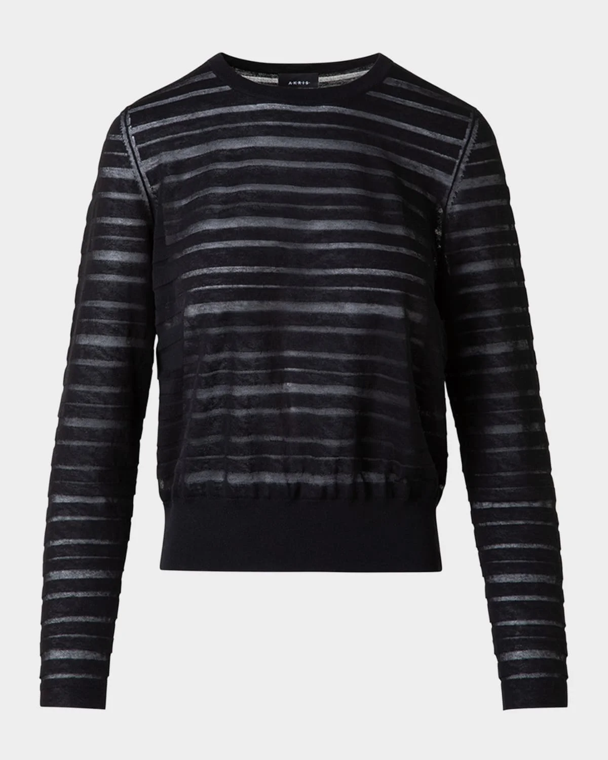 Akris knit sweater featuring sheer horizontal stripe intarsia Crew neckline Long sleeves Relaxed fit Ribbed cuffs and hem Pullover style Cotton/nylon/polyamide Dry clean Made in Romania