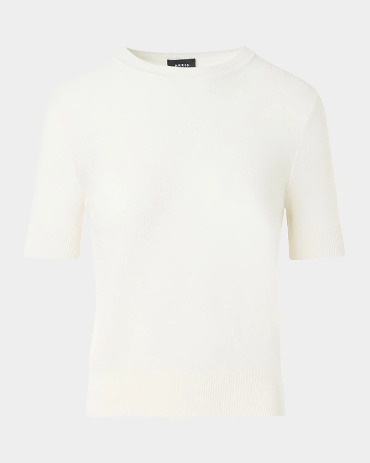 Akris sweater is crafted of a silkblend pointelle knit Crew neckline Short sleeves Fitted Ribbed cuffs and hem Pullover style Silk/cotton Made in Romania