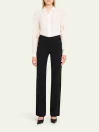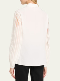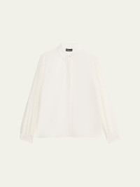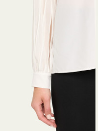 Akris silk crepe blouse framed with pleated statement sleeves Shirt collar Long sleeves; button cuffs Relaxed fit Hip length Hidden button front closure Silk Dry clean Made in Romania Online Inquiries: BGS21_B9UEZ| Store Inquiries: #4970767