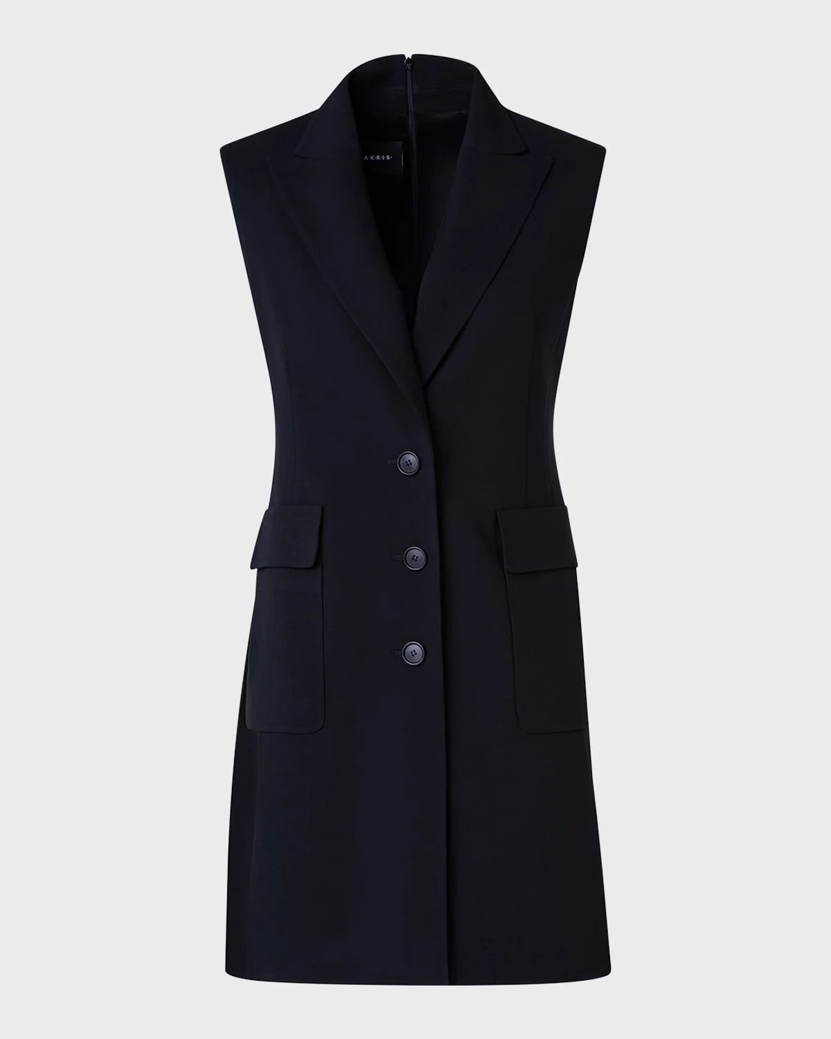 Akris tuxedo dress in double face wool Peak lapels; singlebreasted front Sleeveless Side flap pockets Sheath silhouette Midthigh length Invisible back zip closure Wool/polystyrene Made in Switzerland
