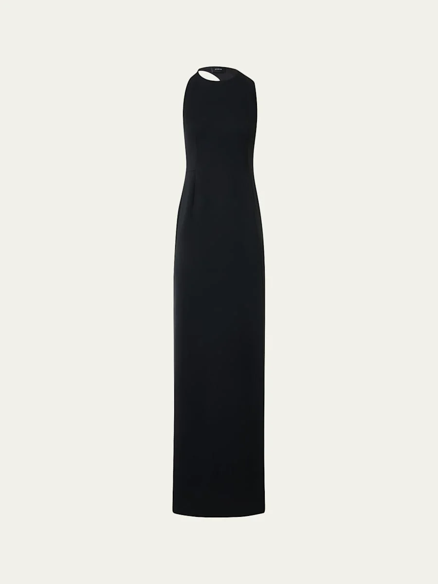 Crafted from doubleface wool, this gown from Akris features an orbit back cutout and a side slit hem Round neckline; button side Sleeveless Column silhouette Floor length Side slit hem Invisible side zip Wool/nylon/polyamide Lining: Silk/viscose Dry clean Made in Romania SIZE amp; FITModel measurements: 5'10" tall Model is wearing a US size 4/Small