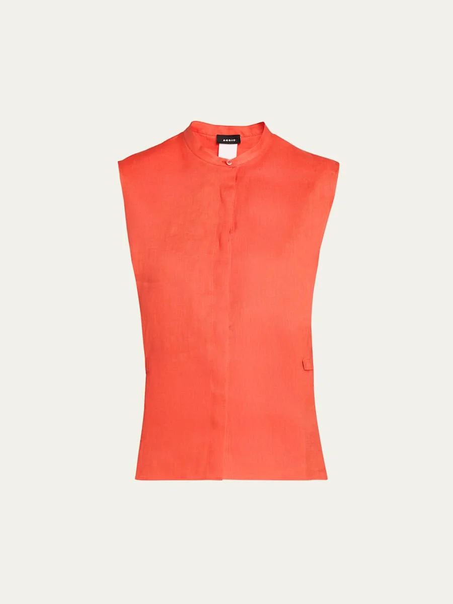 Crafted from lightweight linen, this blouse from Akris features inset shoulder pleats and is cinched with inner drawstring side panels Band collar; concealed button front Sleeveless Slim fit Hip length Linen Made in Romania "SIZE amp; FITModel measurements: 5'10"" tall Model is wearing a US size 4/Small