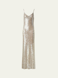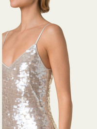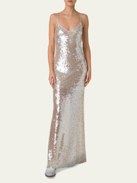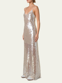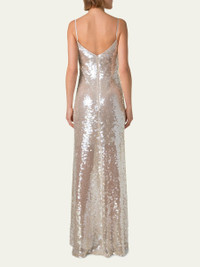 Akris sequin gown V neckline Sleeveless Full length A-line silhouette Invisible back zipper Polyester/nylon/polyamide/metallic fibers Lining: Viscose Dry clean Made in Romania Online Inquiries: BGS21_B9QKP| Store Inquiries: #4945504