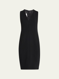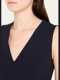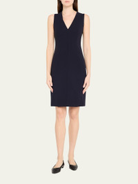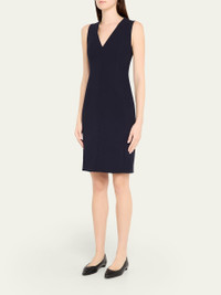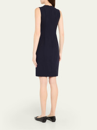Doubleface knit. Approx. 38"L from shoulder to hem. V neckline; back zip. Wide shoulder straps with seamed accent at edges. Princess seams contour fitted silhouette. Slits ease straight hem above knee. Back zip. Wool/nylon. Item comes without belt. Made in Switzerland.
