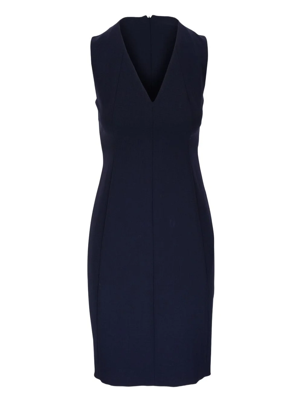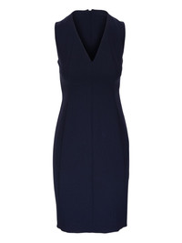 V-neck sleeveless dress Highlights - Navy blue - V-neck - Sleeveless - Rear zip fastening - Fitted bodice - Straight hemline Made in Italy Composition Outer: Wool 99%, Polyamide 1% Lining: Silk 92%, Elastane 8% Washing instructions Read Manufacturer Guidelines