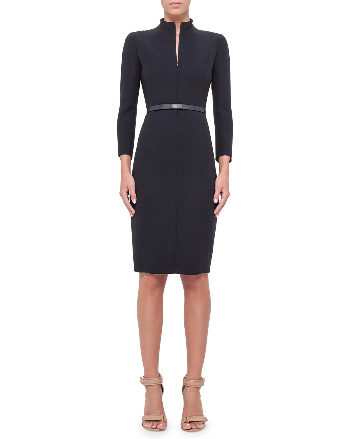 Akris doubleface wool dress. Split mock neckline. Threequarter sleeves. Leather selfbelt. Fitted silhouette. Straight hem. Wool/nylon. Silk/spandex lining. Made in Romania.