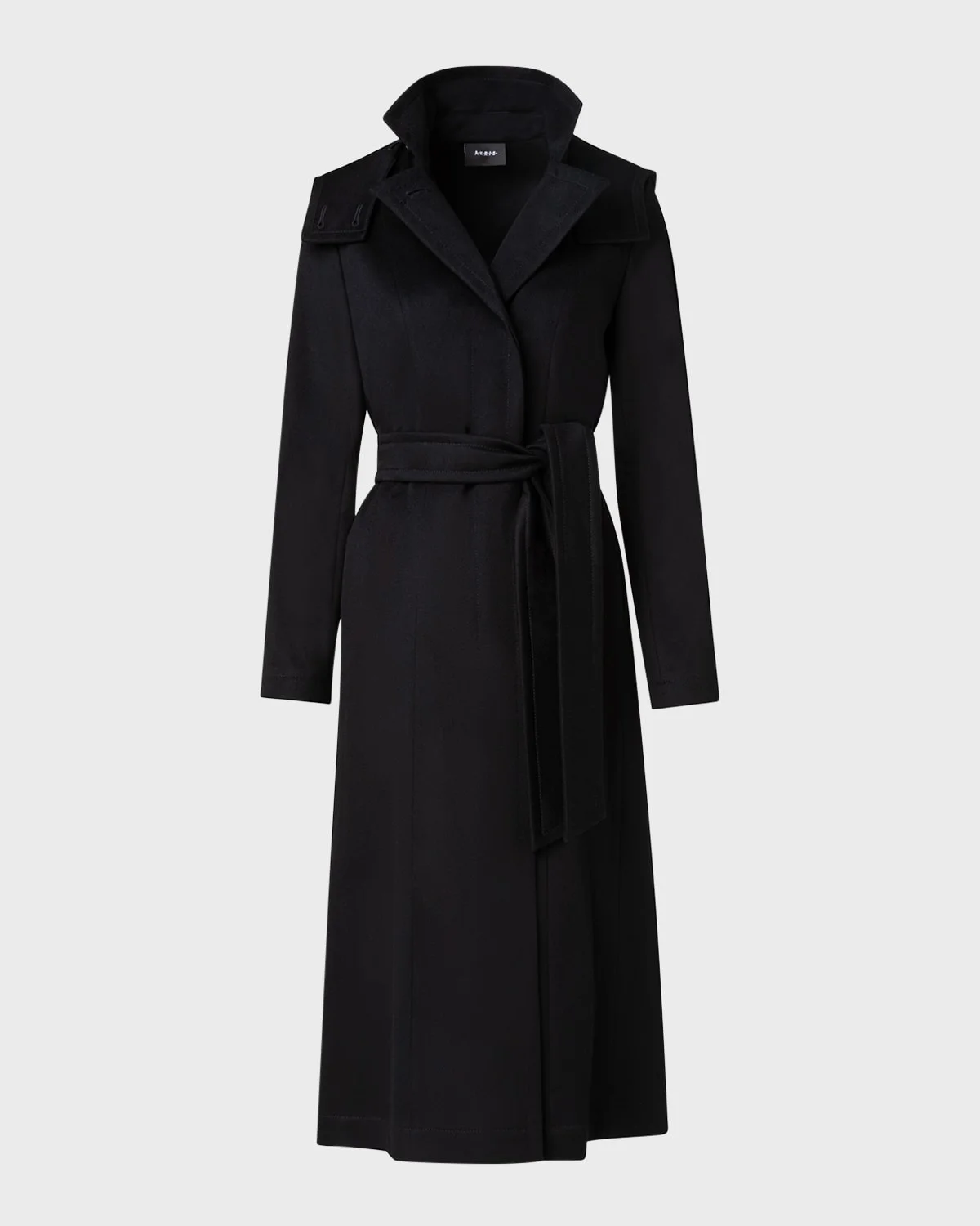 Akris storm system coat Stand collar; button front Long sleeves Side seam pockets Selftie waist Tailored fit Midcalf length Cashmere Silk lining Made in Italy