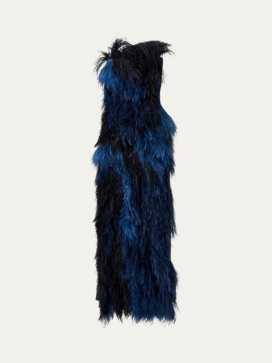 Akris corsage gown in all-over dyed ostrich feathers (Italy) on silk Strapless neckline Sleeveless Sheath silhouette High side slit hem Side zip closure Silk/cotton/polyester Lining: Viscose/silk Dry clean Made in Romania Online Inquiries: BGS21_BA4PA| Store Inquiries: #5035700