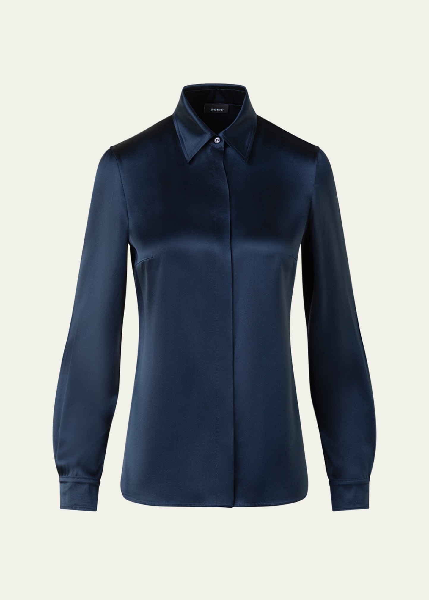 Akris blouse in stretch silk satin Point collar; concealed button front Long sleeves; button cuffs Slim fit Silk/elastane Dry clean Made in Romania Online Inquiries: BGS21_BA26F| Store Inquiries: #5019818