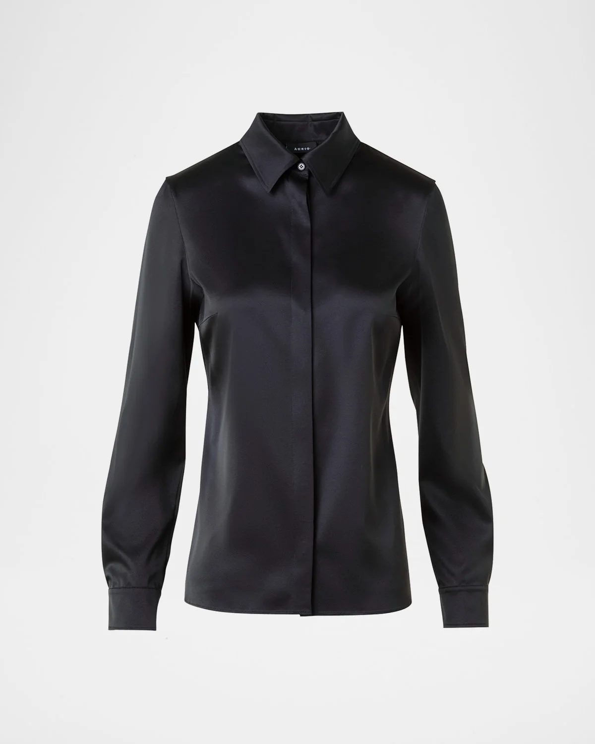 Akris blouse in stretch silk satin Point collar; concealed button front Long sleeves; button cuffs Slim fit Silk/elastane Dry clean Made in Romania