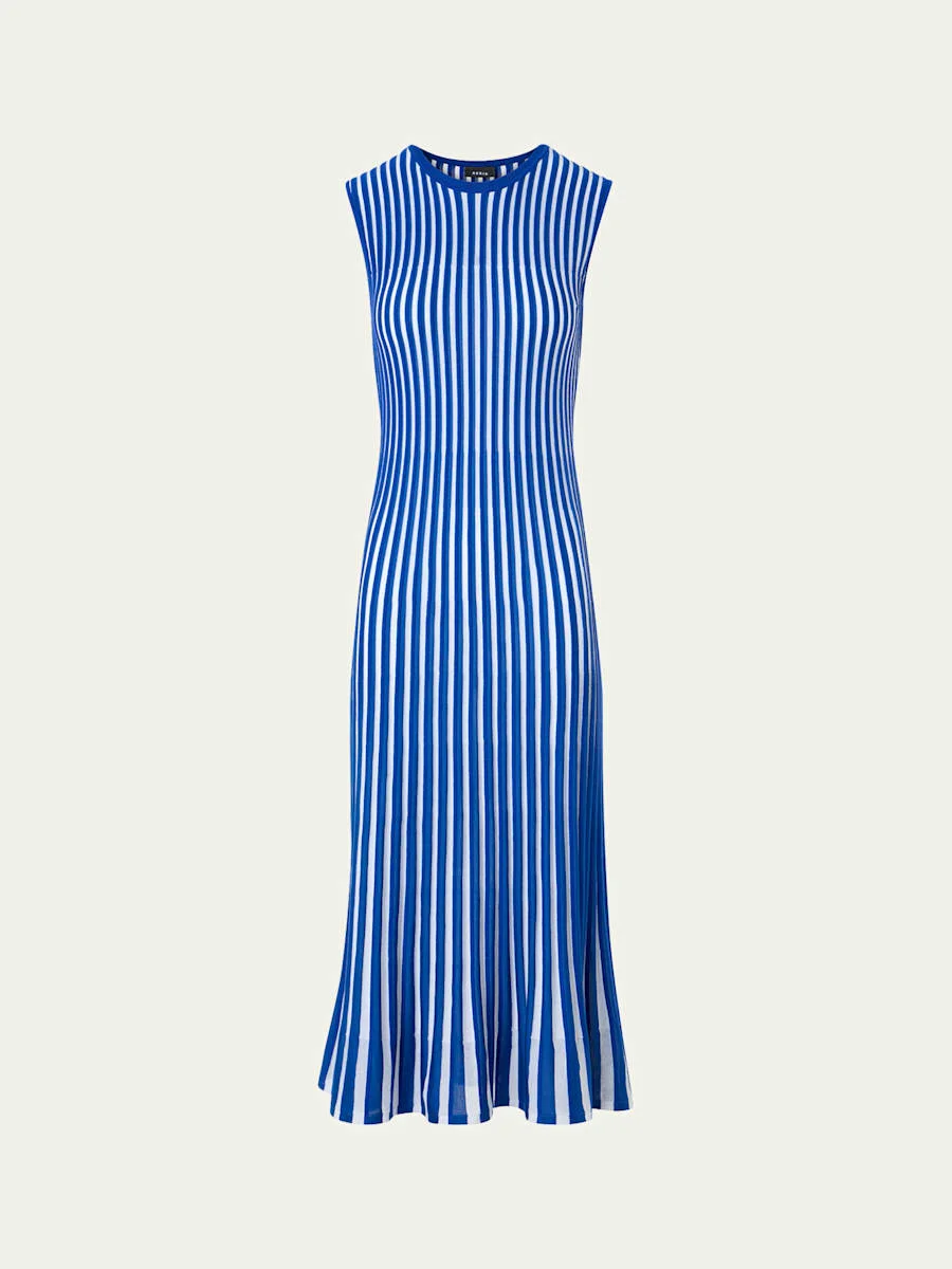 Crafted of stretch silkblend plisse knit, this dress from Akris features a striped intarsia and a slight aline silhouette. Round neckline Sleeveless Aline silhouette Hem falls below the knee Back zip closure Silk/virgin wool/cotton/nylon/elastane Dry clean Imported