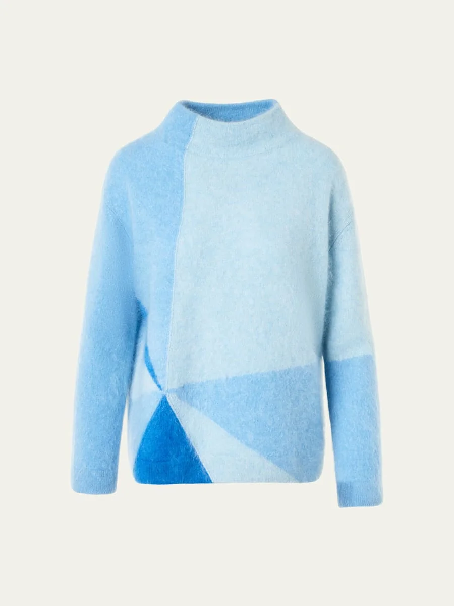 Akris sweater is knit in a fuzzy cloud cashmere with sunbeam intarsia Mock funnel neckline Long sleeves Drop shoulders Loose fit Pullover style Cashmere Dry clean Imported Online Inquiries: BGS21_BAZN5| Store Inquiries: #5358011