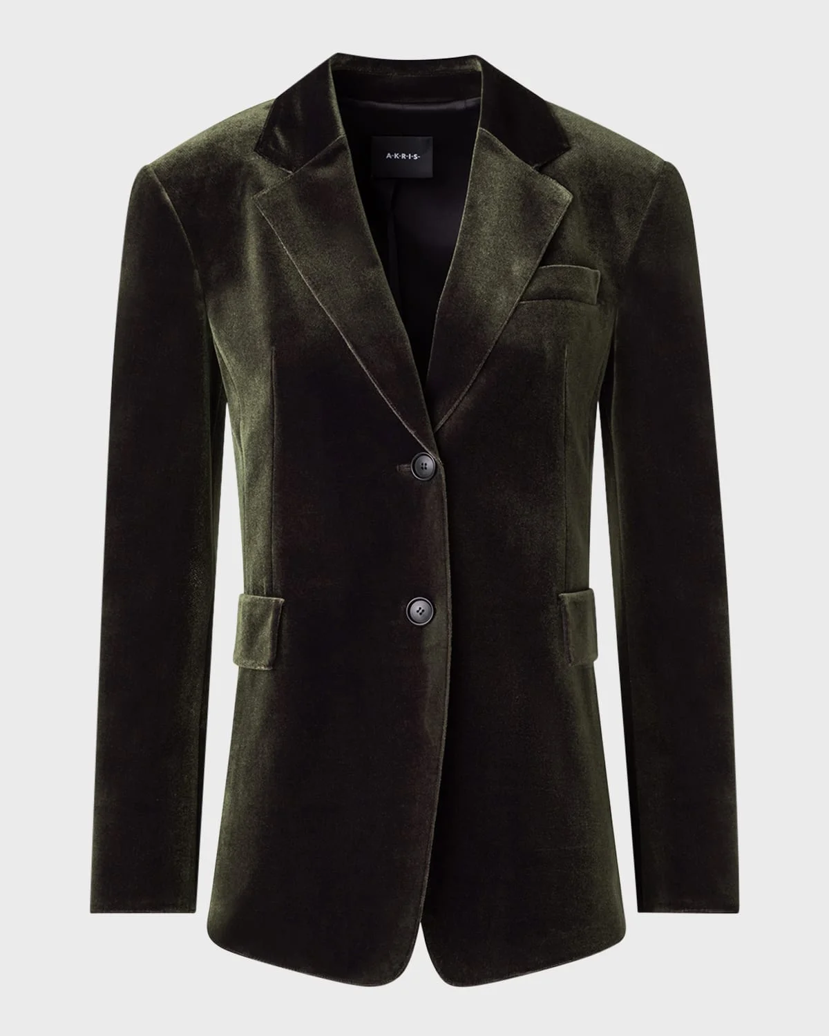 Akris "Taddeo" blazer jacket in an allover stretch velvet finish Single breasted front Peak lapel collar Button closure Long sleeves Side flap pockets Midlength Tailored silhouette Polyester/elastane Dry clean Made in Switzerland