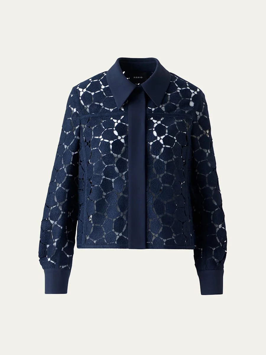 Akris "Talitha" jacket presented in Broken Stones embroidery Point collar; concealed button placket Long bishop sleeves with button cuffs Yoked back Relaxed fit Hip length Wool/acrylic/polyester Lining: Cupro Dry clean Made in Romania Online Inquiries: BGS21_BA4PK| Store Inquiries: #5035709