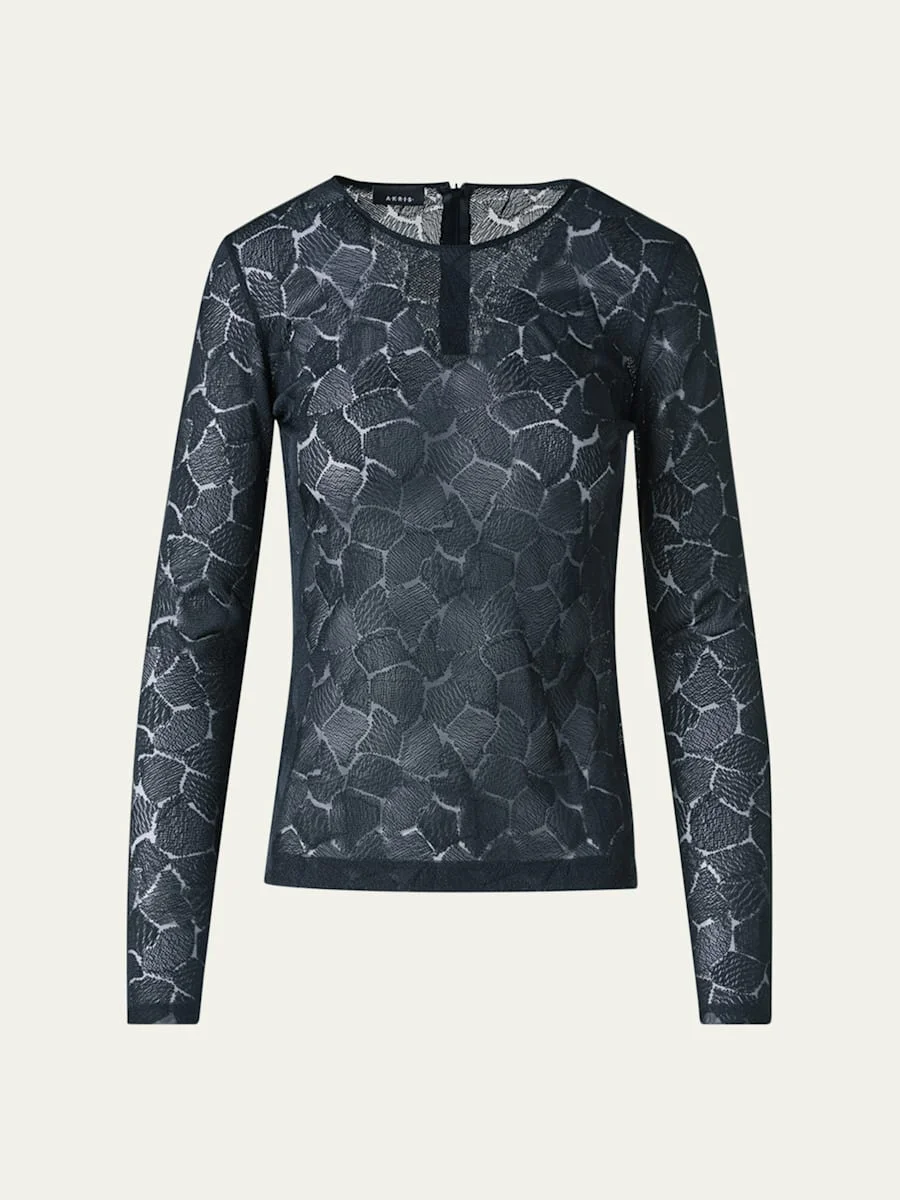 Akris shirt presented in semi-sheer Broken Stone jacquard Crew neckline Long sleeves Hip length Fitted Concealed back zip closure Polyester Dry clean Made in Switzerland Online Inquiries: BGS21_BA4P7| Store Inquiries: #5035697