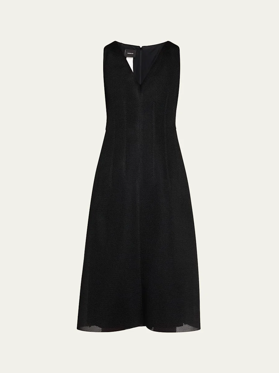 Akris dress crafted in a techno grid construction V neckline Sleeveless Fitted waist Hem falls below the knee Flared A-line skirt Invisible back zipper Polyester Lining: Viscose Dry clean Made in Romania Online Inquiries: BGS21_B9UFT| Store Inquiries: #4970795