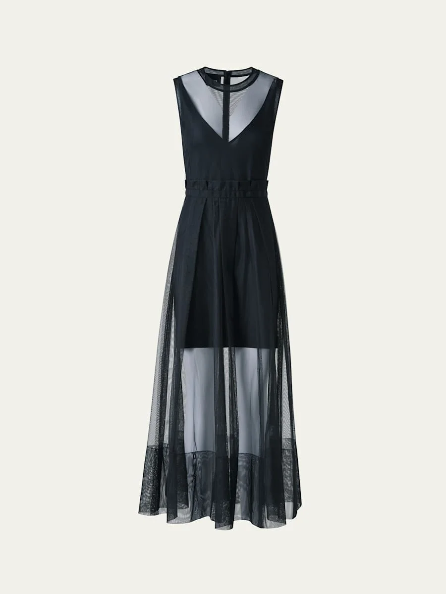 Akris techno tulle gown with sheer paneling Crew neckline Sleeveless Fit-and-flare silhouette Hem falls below the knee Center back zip Silk Lining: Viscose Dry clean Imported Online Inquiries: BGS21_BA4PB| Store Inquiries: #5035701