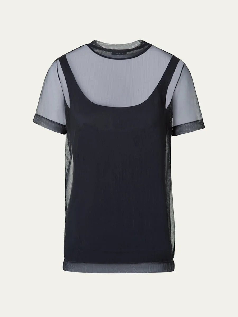 Akris T-shirt in techno tulle stretch features a streamlined fit with a soft, breathable texture Tank included Crew neckline Short sleeves Relaxed fit Pullover style Nylon/polyamide/elastane Lining: Viscose Dry clean Made in Romania Online Inquiries: BGS21_B9UGB| Store Inquiries: #4970815
