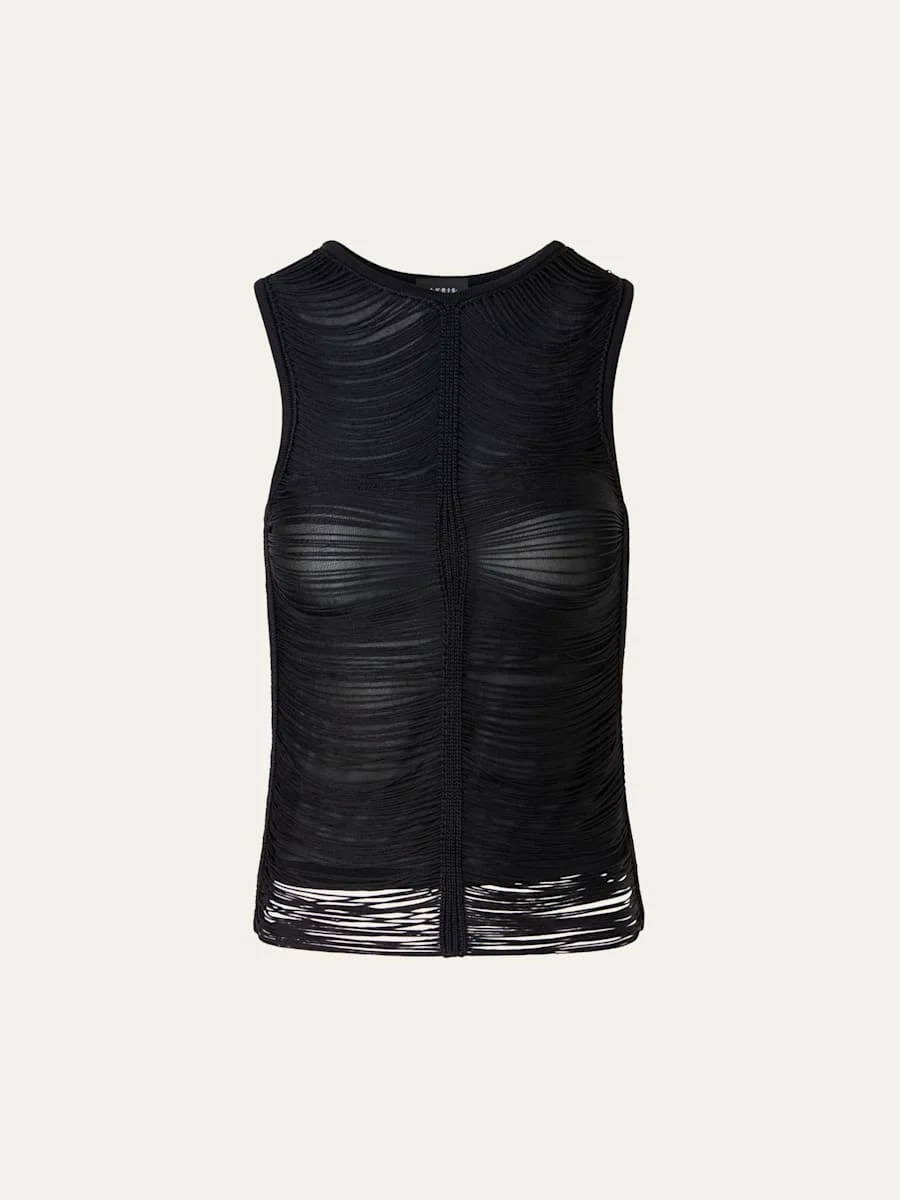 Constructed with trapezoid embroidery, this blouse by Akris is knit from silk High neckline Sleeveless Slim fit Hip length Slipover style Silk Dry clean Made in Romania
