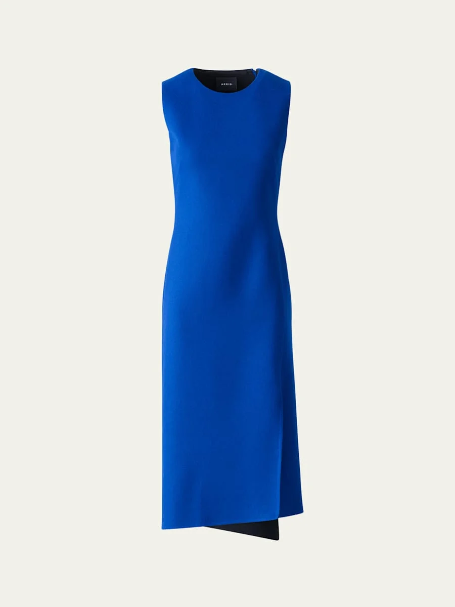 Akris dress featuring trapezoid panels and side slits Round neckline Sleeveless Sheath silhouette Hem falls below the knee Back zip Virgin wool Lining: Silk Dry clean Made in Switzerland