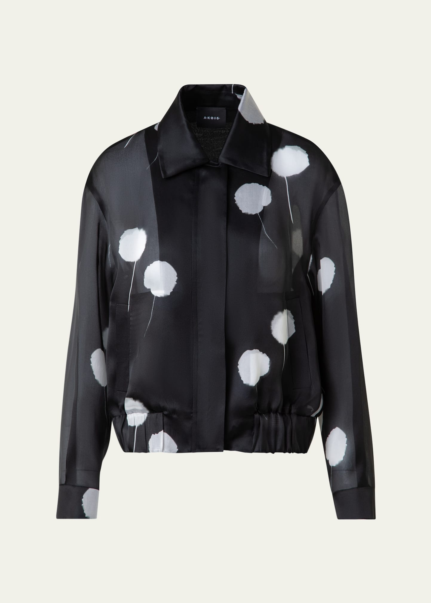 Akris "Wanda" silk crepe blouson jacket featuring a windflower print back yoke and elasticized hem Spread collar; concealed zip front Long sleeves; button cuffs Side welt pockets Relaxed fit Silk Dry clean Made in Romania Model is 5'10"/177cm. Online Inquiries: BGS21_B9F6H| Store Inquiries: #4859290