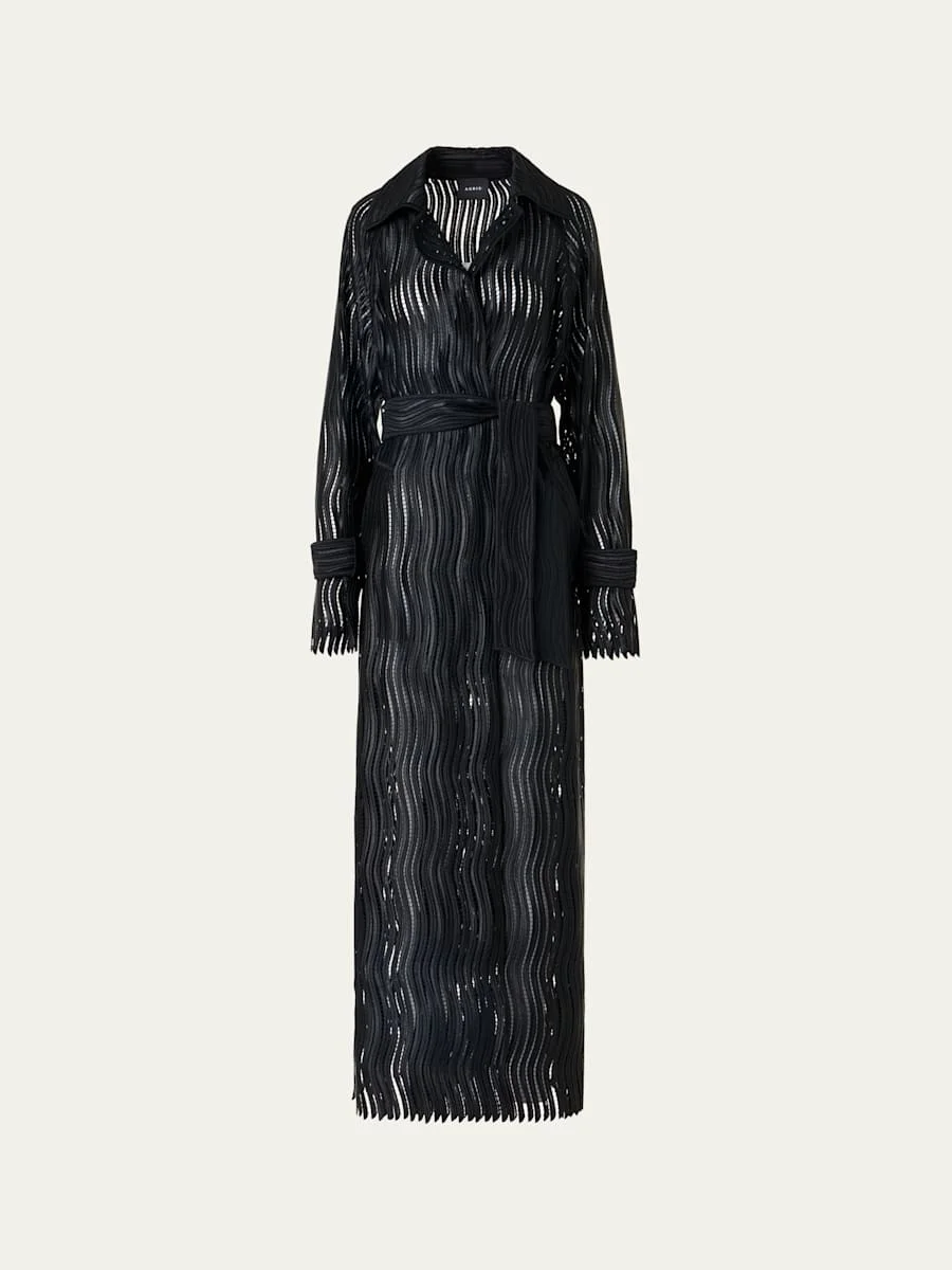 Akris coat is crafted from wavy lattice embroidery cinched at the waist with a self waist sash Spread collar; singlebreasted front Long sleeves; snaptab cuffs Hip welt pockets Selftie belted waist Straight fit Floor length Concealed front closure Polyester Dry clean Made in Switzerland