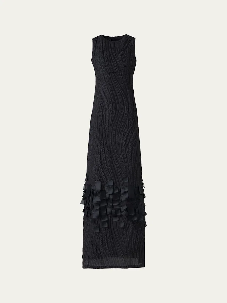 Akris gown in waves jacquard with ribbon applique Round neckline Sleeveless A-line silhouette Floor length Side slits Back zip Silk/nylon/polyamide Lining: Silk/viscose Dry clean Made in Switzerland Online Inquiries: BGS21_BA27W| Store Inquiries: #5019853