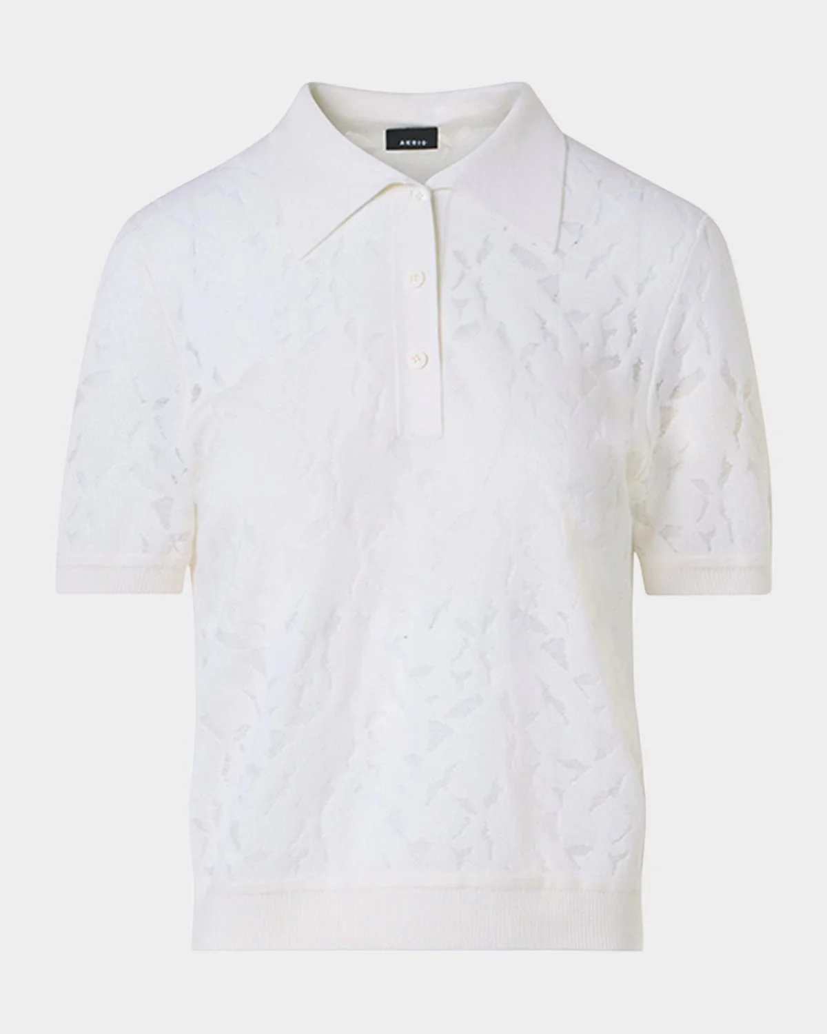 Whitecaps jacquard knit defines this Akris polo shirt, blending understated elegance with refined texture. Point collar; threebutton placket Short sleeves Ribbed cuffs and hem Relaxed fit Virgin wool/silk/nylon/polyamide Made in Romania