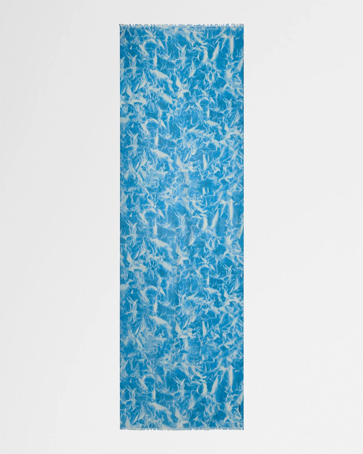 Akris lightweight cashmere scarf with a whitecaps print Approx. 78.7"L x 25.6"W Eyelash fringed edges May be style multiple ways Cashmere Dry clean Made in Romania