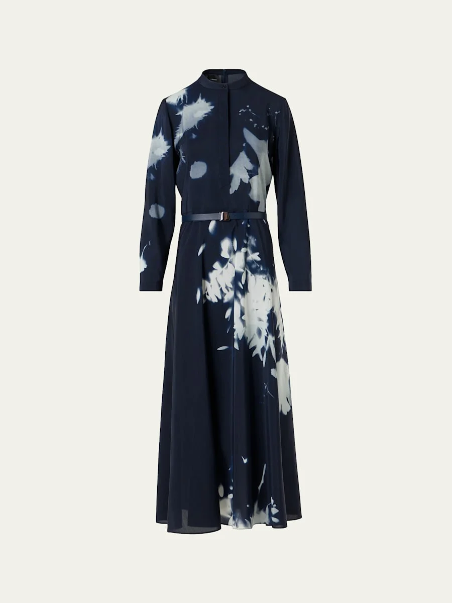 Akris silkblend voile dress featuring a wildflower print Band collar; concealed half button front Long sleeves; button cuffs Ankle length Aline silhouette Back zip Silk/wool Lining: Silk/viscose Dry clean Made in Switzerland