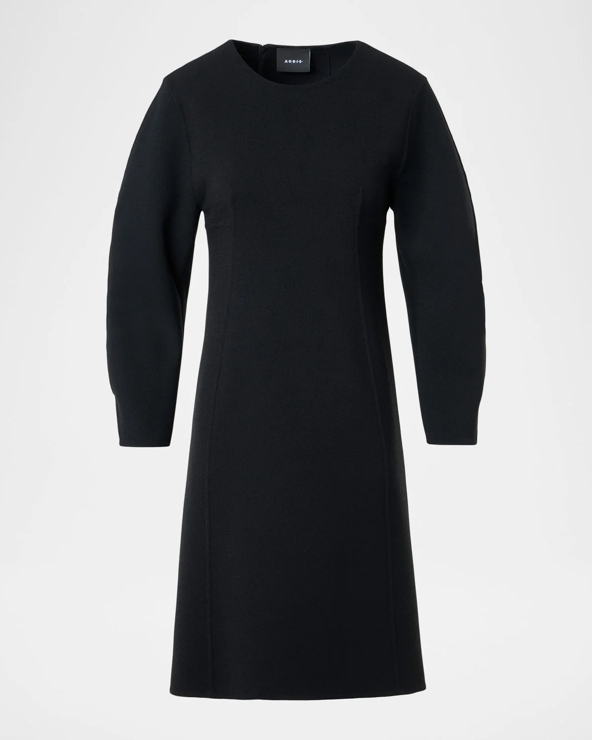 Akris dress is crafted from woolblend crepe Round neckline Long curved sleeves Aline silhouette Midthigh length Back zip Wool/polyester Made in Switzerland