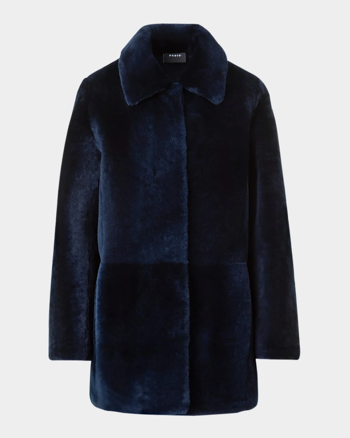 - Akris "Yaron" coat in dyed merino sheep shearling (Turkey) - Point collar; single-breasted front - Long sleeves - Straight fit - Hem falls below the hip - Concealed button front - Shearling - Dry clean - Made in Romania