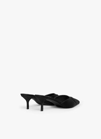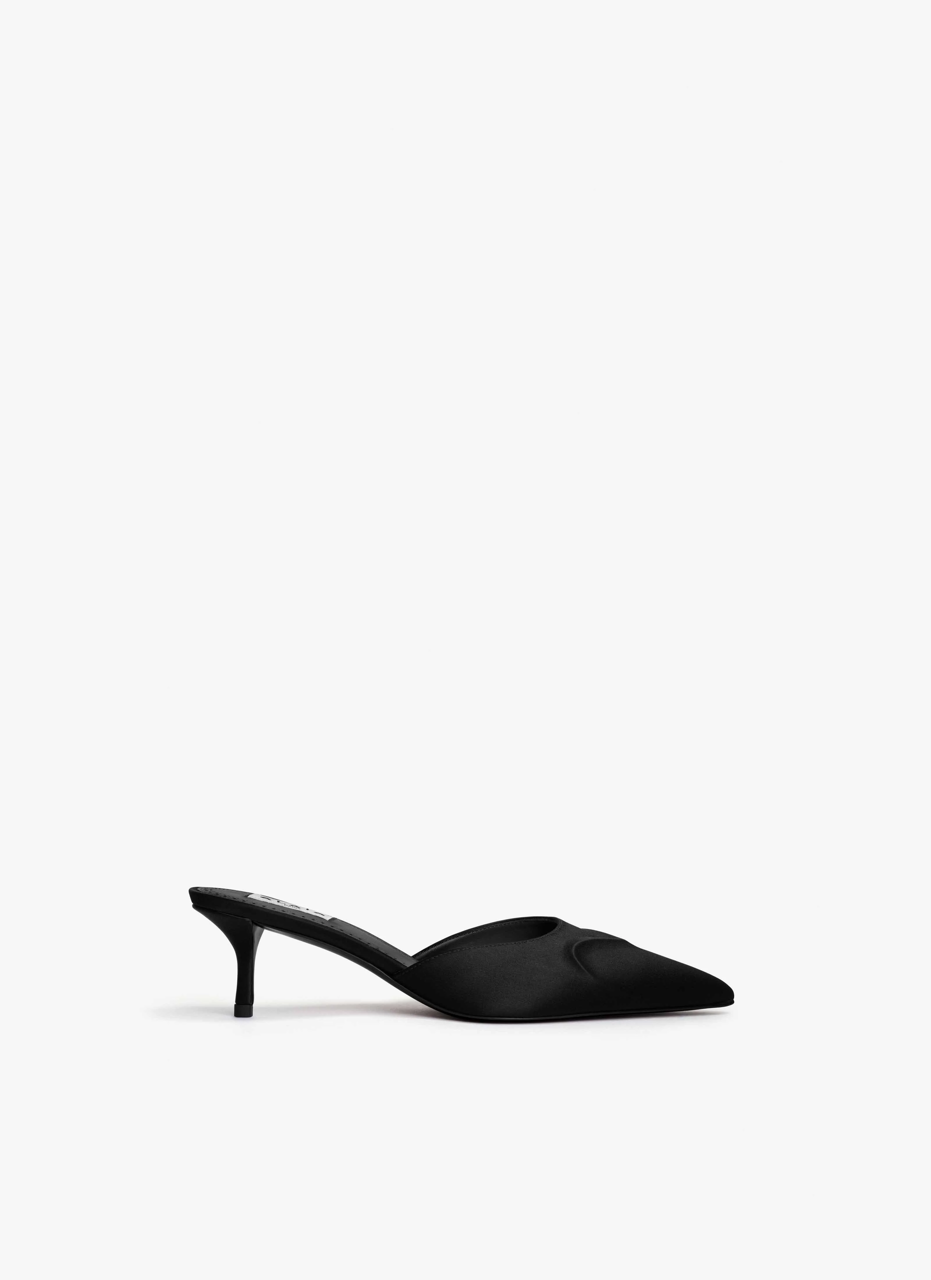 Pointy kitten heels mules with a tonal 3D heart on the toe, a new take on the signature Le Cœur line 55 mm heel Satin fabric Made in Italy DETAILS MAIN LINING:100%LAMBSKIN SOLE:80% CALFSKIN LEATHER 20% RUBBER UPPER MATERIAL 1:72% VISCOSE 28% SILK PRODUCT REFERENCE : AA3M109TK019 - 999