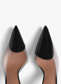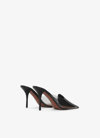 Asymmetrical heel mules Half-heart cut at the front of the shoe Patent calfskin and transparent polyurethane Heel height : 90mm Made in Italy DETAILS MAIN LINING: 100% LAMBSKIN SOLE: 80% CALFSKIN LEATHER 20% RUBBER UPPER MATERIAL 1: 80% POLYURETHANE 20% CALFSKIN LEATHER PRODUCT REFERENCE: AA3M094CK150 - 999