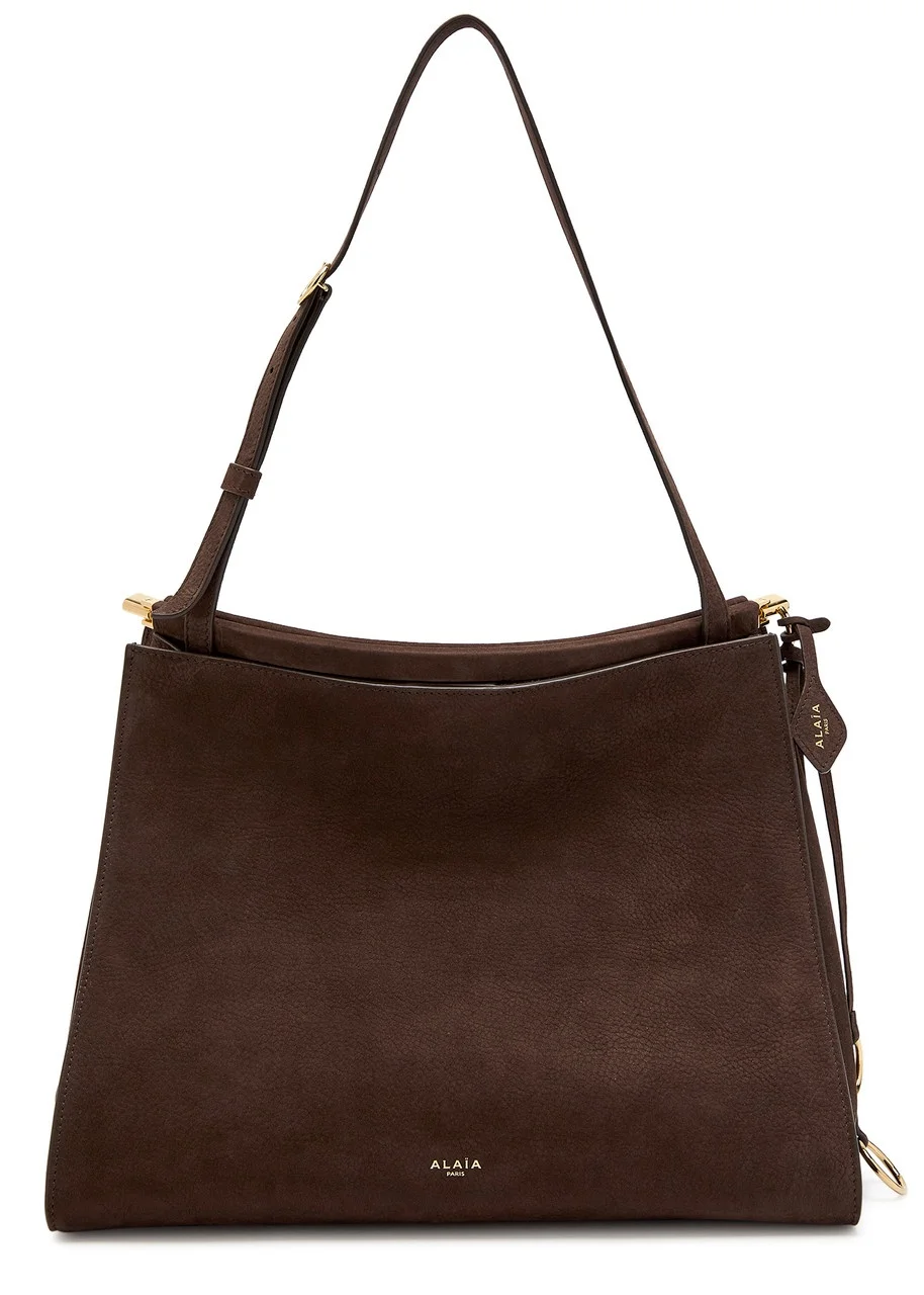 Info & Care Alaia nubuck shoulder bag Adjustable shoulder strap, detachable designer tag, detachable metal ring-embellished charm, metallic designer stamp, press-stud fastening sides, two compartments, fully lined Concealed magnetic fastening at top Size & Fit Width: 12.5 inches/ 32cm Height: 9 inches/ 23cm Depth: 5.5 inches/ 14cm Min. shoulder strap drop: 9.5 inches/ 24cm Max. shoulder strap drop: 11.5 inches/ 29.5cm