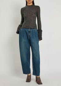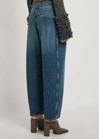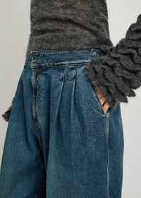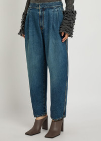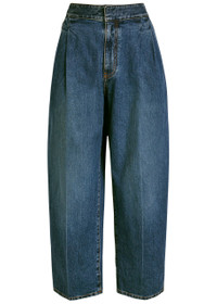 Info & Care Alaia denim jeans High-waist fit, barrel-leg cut, pleats at waist, four pockets, pressed crease through legs, button-fastening tabs at back waist, faded finish Partially concealed zip, hook and button fastening at front 99% cotton, 1% polyurethane Machine wash cold inside out to avoid colour transfer Size & Fit Front rise: 11.5 inches/ 29cm Inside leg length: 27.5cm Midweight Model is 5'10"/ 178cm and wears a size;FR36