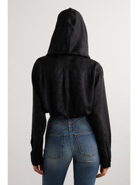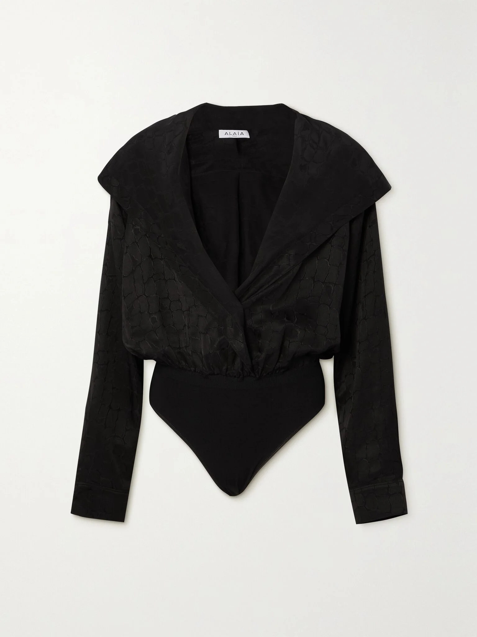 Part of the maison's 'Archetypes' collection, Alaia's bodysuit has a wrap-style front that creates an alluring plunging neckline. It's made from croc-effect satin-jacquard with a subtle sheen that's enhanced by the draped construction. Pop the hood for maximum drama. Size & Fit - Fits true to size, take your normal size - Minimal brief coverage - Mid-weight, non-stretchy fabric with slightly stretchy panels - Model is 177cm/ 5'10" and is wearing a FR 36 Details & Care - Black satin-jacquard - Snap fastenings at base - 55% viscose, 45% silk - Dry clean
